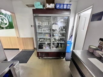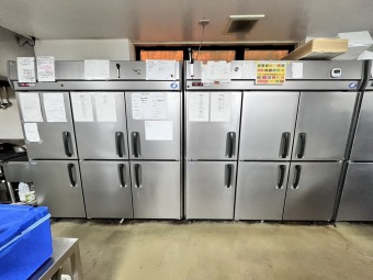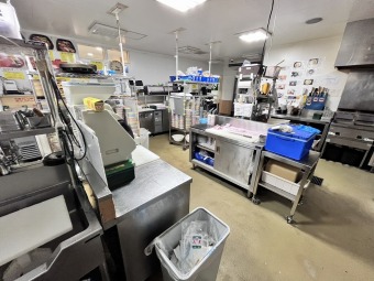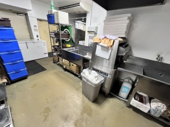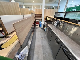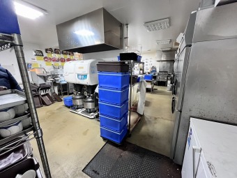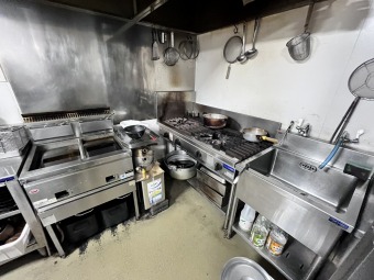 ステンレス中心の厨房に大型フードなど